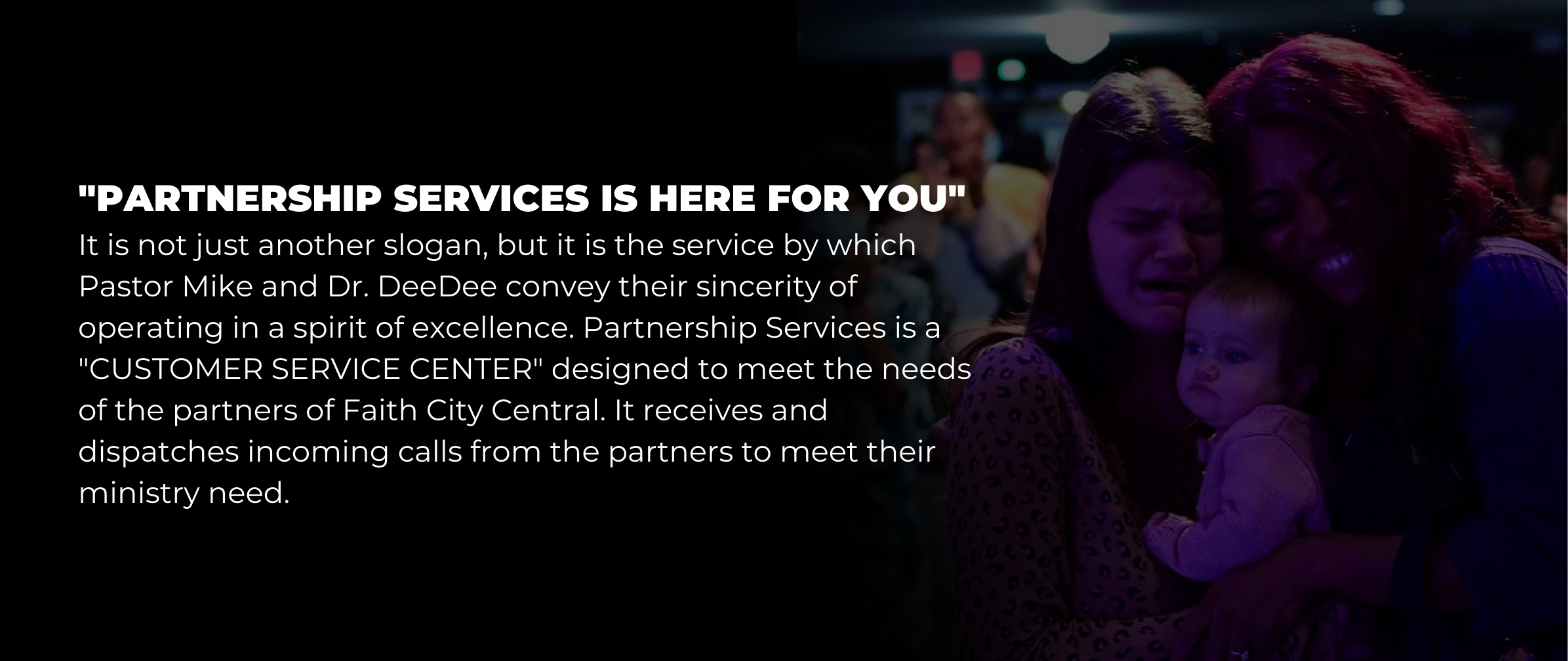 Even as our ministry family continues to grow, the partnership will continue to experience the care and concern of Pastor Mike through the Partnership Services Department. The personal ministry that Partnership Services provides, during the most critical and enjoyable times in a partner’s life, is an extension of God’s love expressed through our Pastor and those who have been assigned to assist him in this vision. We will not allow size or the magnitude of Faith City Central, in any way, decrease our commitment to meeting the spiritual needs of our partners.